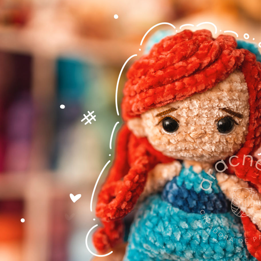 Con este patrón podrás tejer tu propia “Princesa Ari" versión chenille con un toque personal y único. El patrón está diseñado para ser trabajado con un gancho de 3.5 mm e hilaza de grosor medio. Al finalizar, tu amigurumi medirá aproximadamente 19 cm de altura.